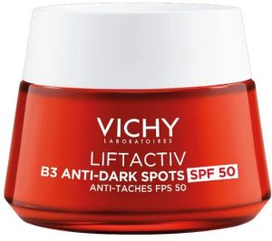 Vichy LIFTACTIV este probabil cea mai bună cremă pentru pete pigmentare. Este desigur o cremă cu mai multe beneficii! Ea deține niancinamidă, ingredient ce ajută la uniformizarea pielii, dar are și protecție solară SPF 50.